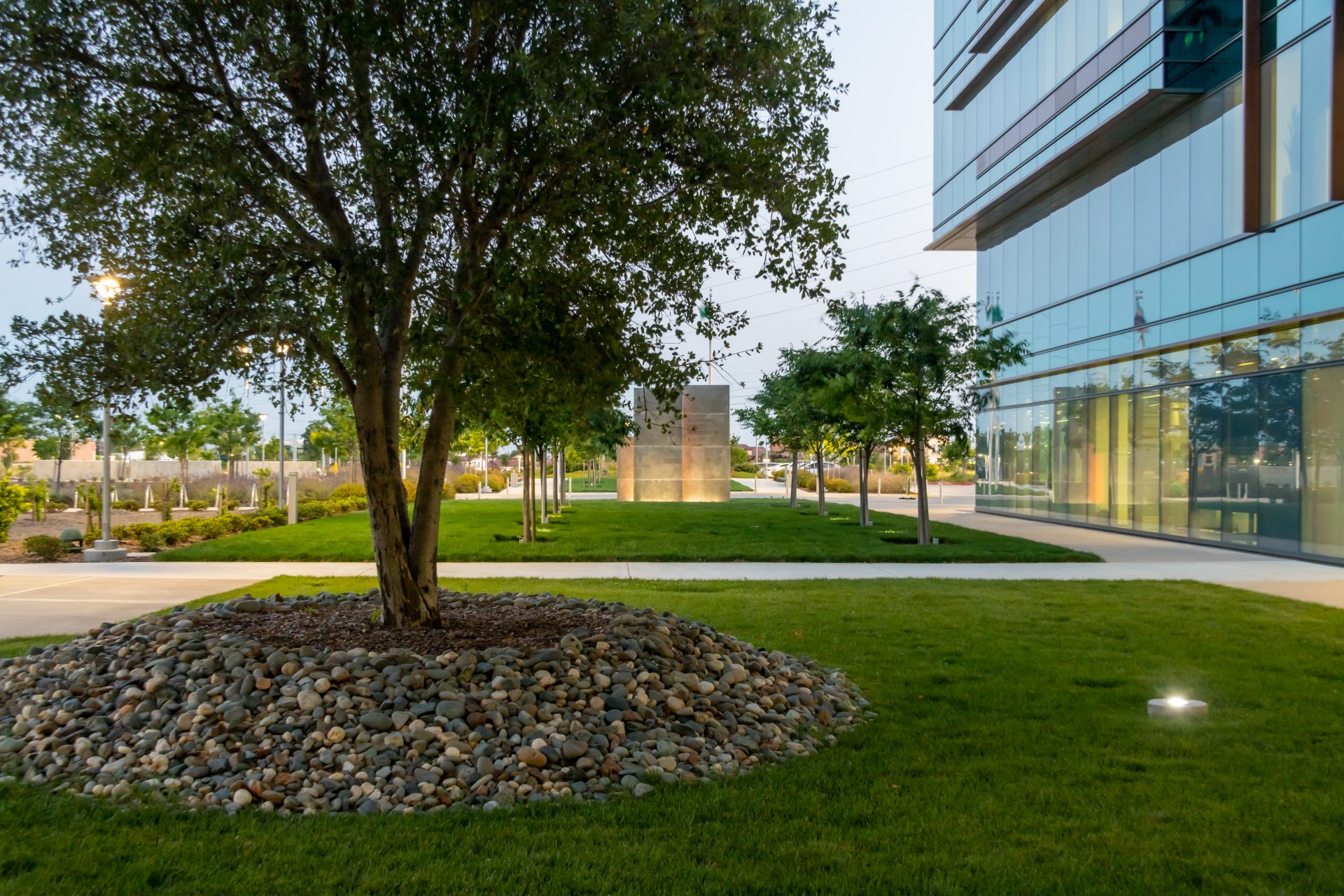 The campus features a multitude of health-centric amenities developed by our site design team including a one-mile walking and biking trail that connects to the Miners Ravine trail in Roseville, a variety of outdoor meeting spaces and a yoga lawn. The landscape architecture is filled with gardens, brand moments, water features, and outdoor dining areas, providing a thoughtfully curated outdoor space with walking paths, outdoor speakers, and park benches equipped with USB charging stations.