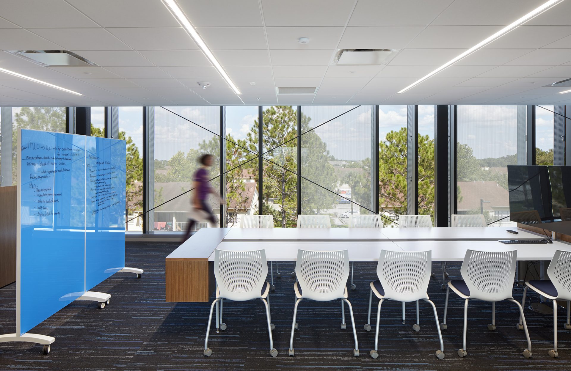 The design team began by connecting the two buildings with a continuous, light-filled glass atrium, providing a single point of entry for all employees and visitors.