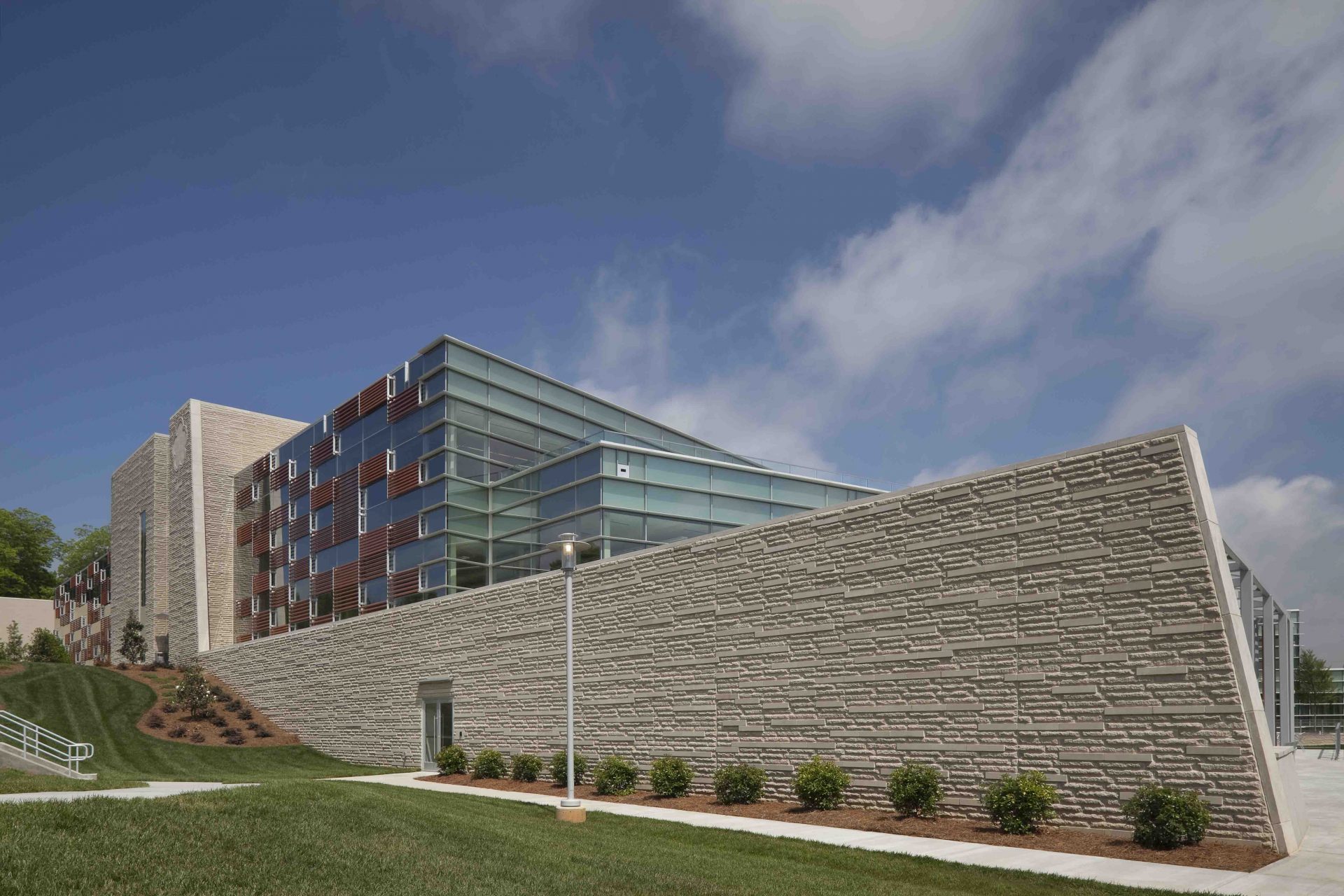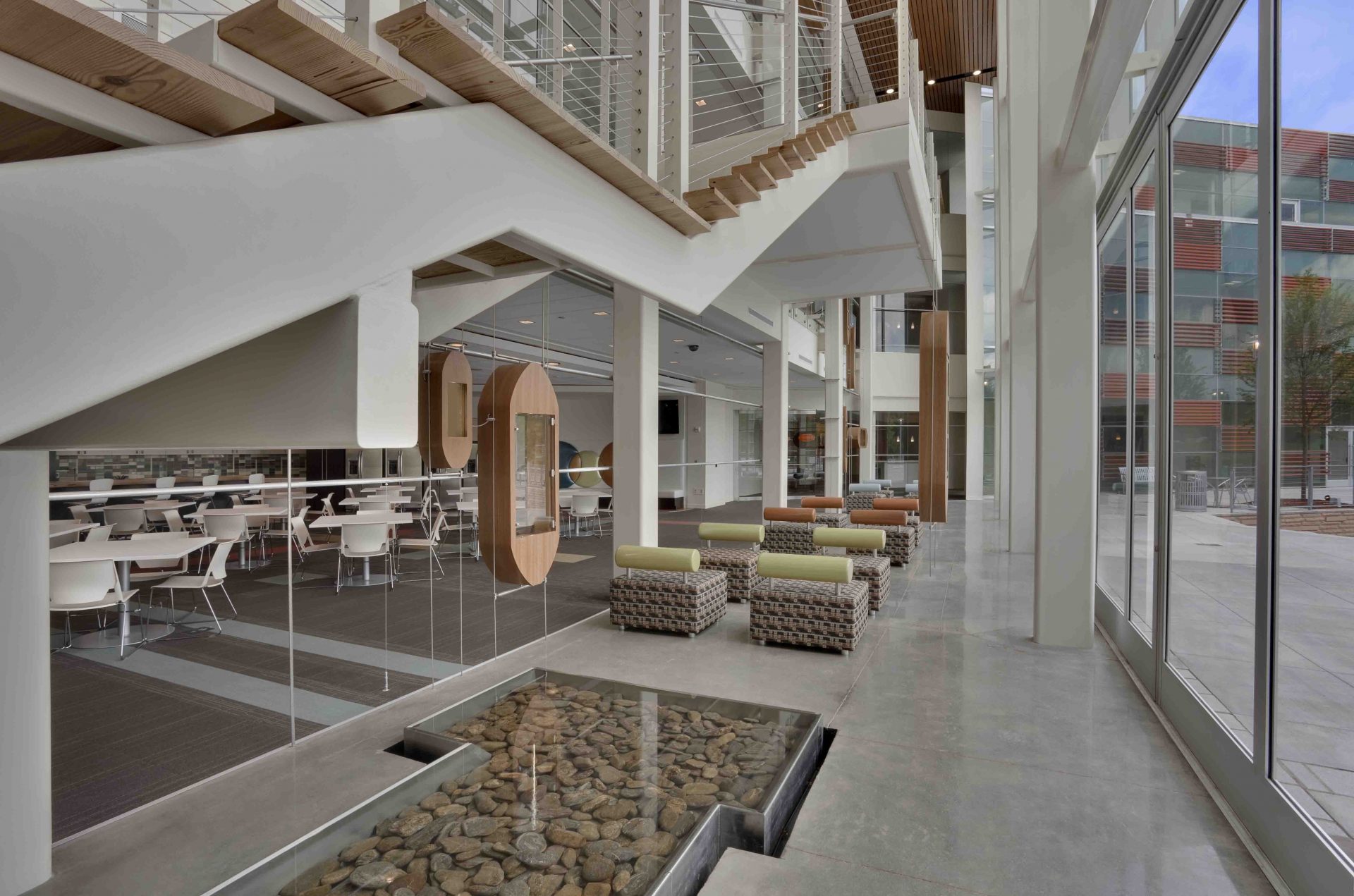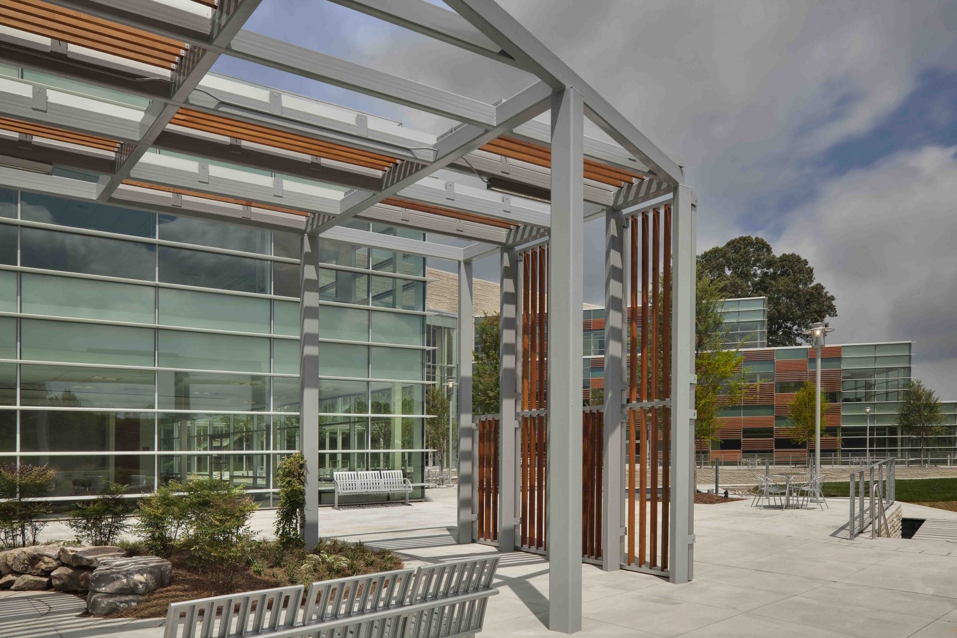 The exterior design consists of a panel system made of glass, allowing for views, and terra-cotta to protect the facades that receive the most sun exposure. The two main department spaces are linked by a public gathering space, a main circulation spine and a secondary circulation spine that forms a perimeter to the public plaza below – serving as a metaphor of a loom by weaving the different departments and individuals together.