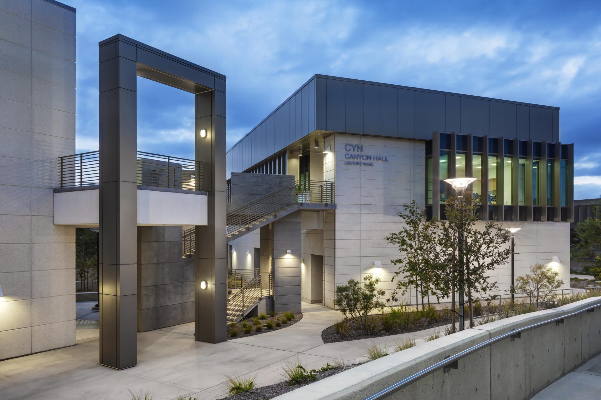 Perched dramatically at the top of a steep slope overlooking magnificent landscaping, this facility connects the two sides of the college's campus.