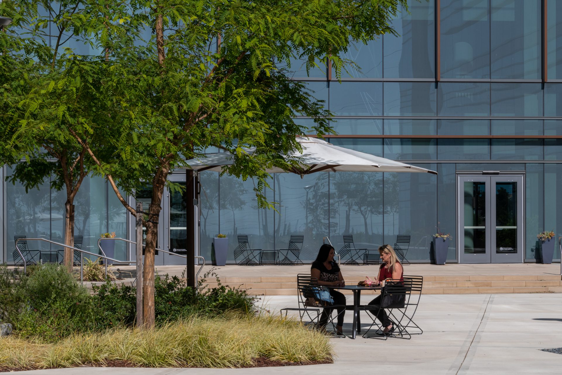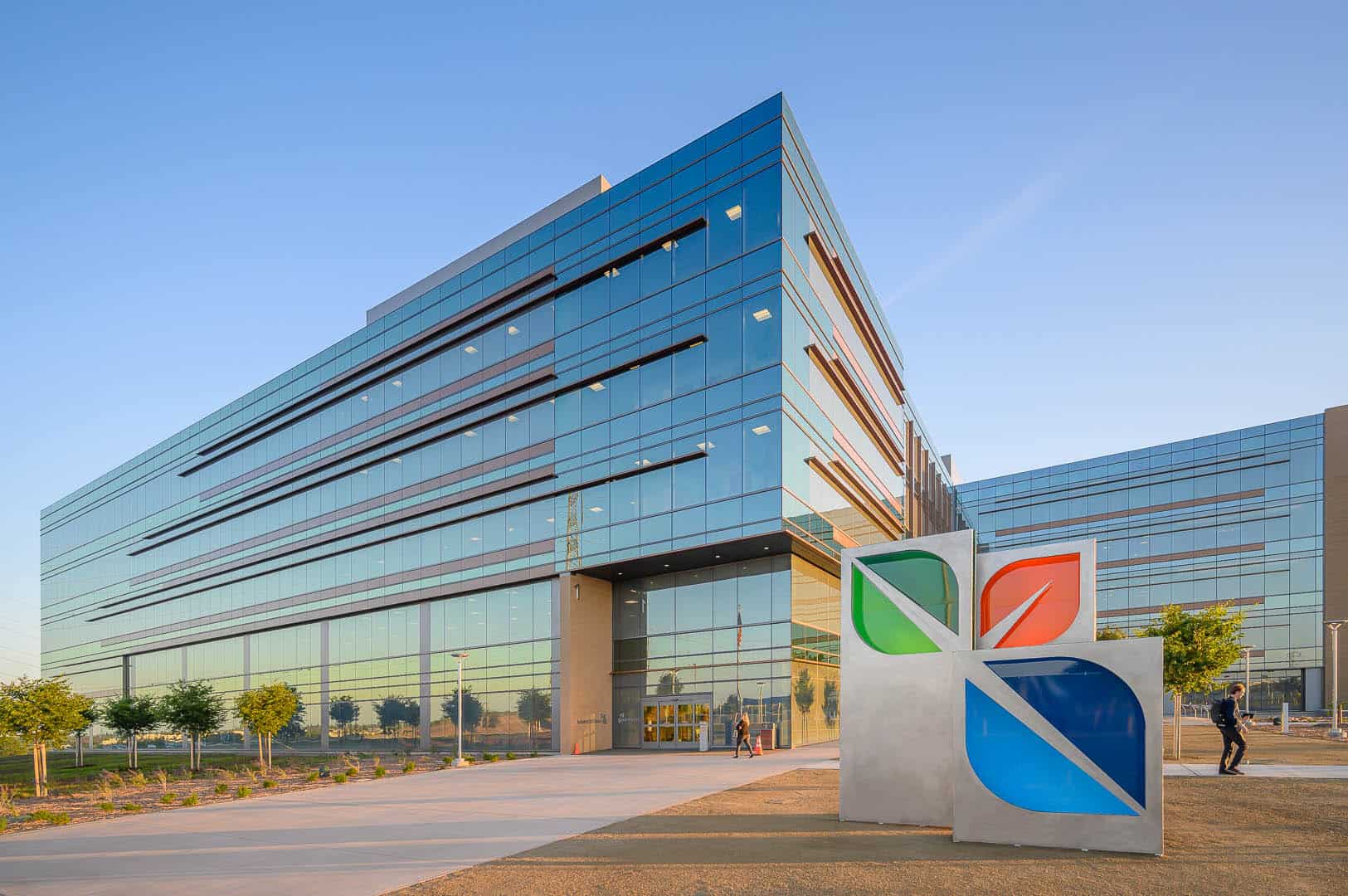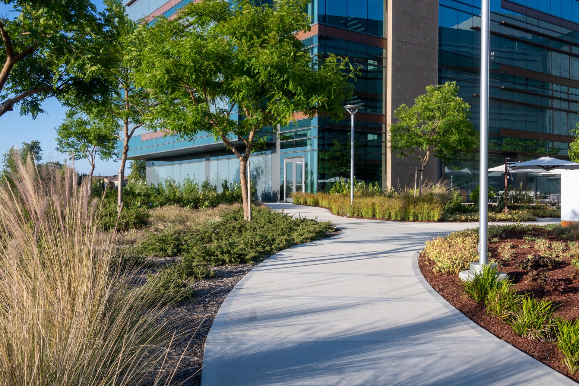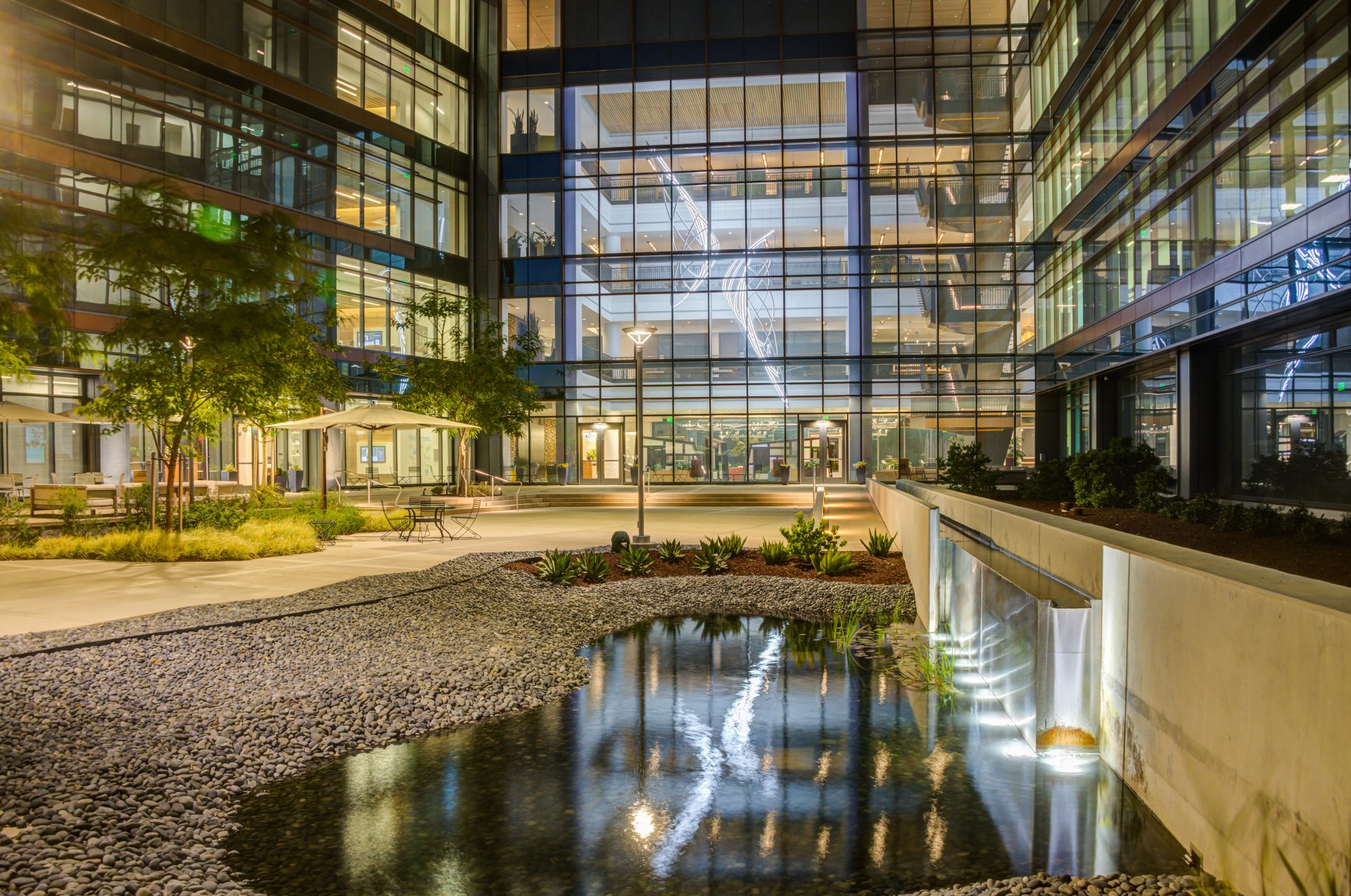 The campus features a multitude of health-centric amenities developed by our site design team including a one-mile walking and biking trail that connects to the Miners Ravine trail in Roseville, a variety of outdoor meeting spaces and a yoga lawn. The landscape architecture is filled with gardens, brand moments, water features, and outdoor dining areas, providing a thoughtfully curated outdoor space with walking paths, outdoor speakers, and park benches equipped with USB charging stations.