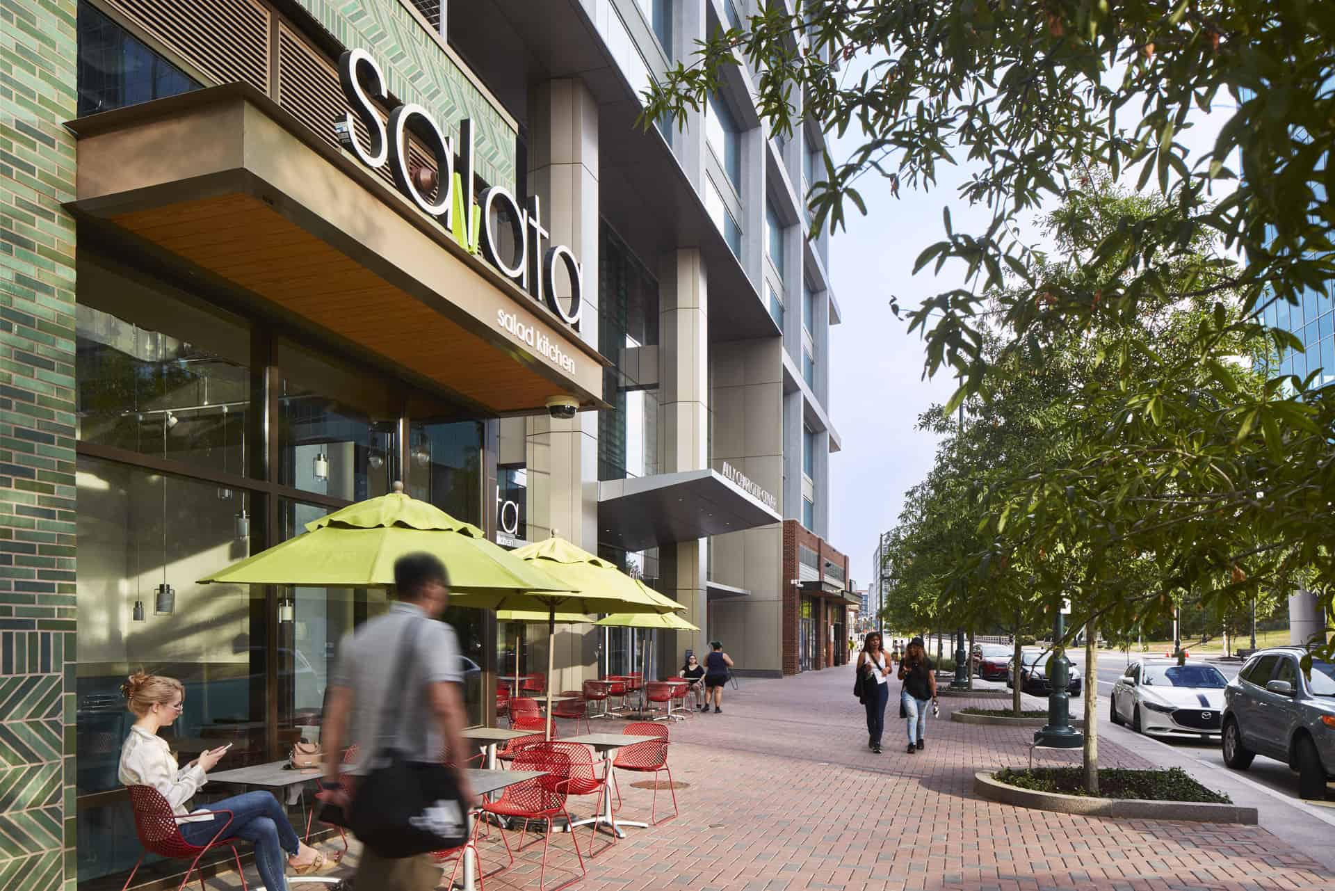 The office tower uses a structural exoskeleton grid to allow for column-free workspaces and is grounded by a public plaza, contemporary retail, and restaurants. Not only did that result in a 360-degree retail base, activating the entire ground floor of the building, it became one of the most efficient floor plates in Charlotte.