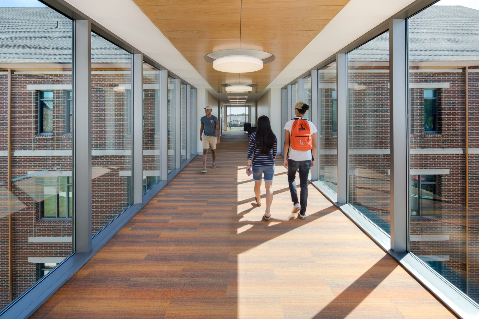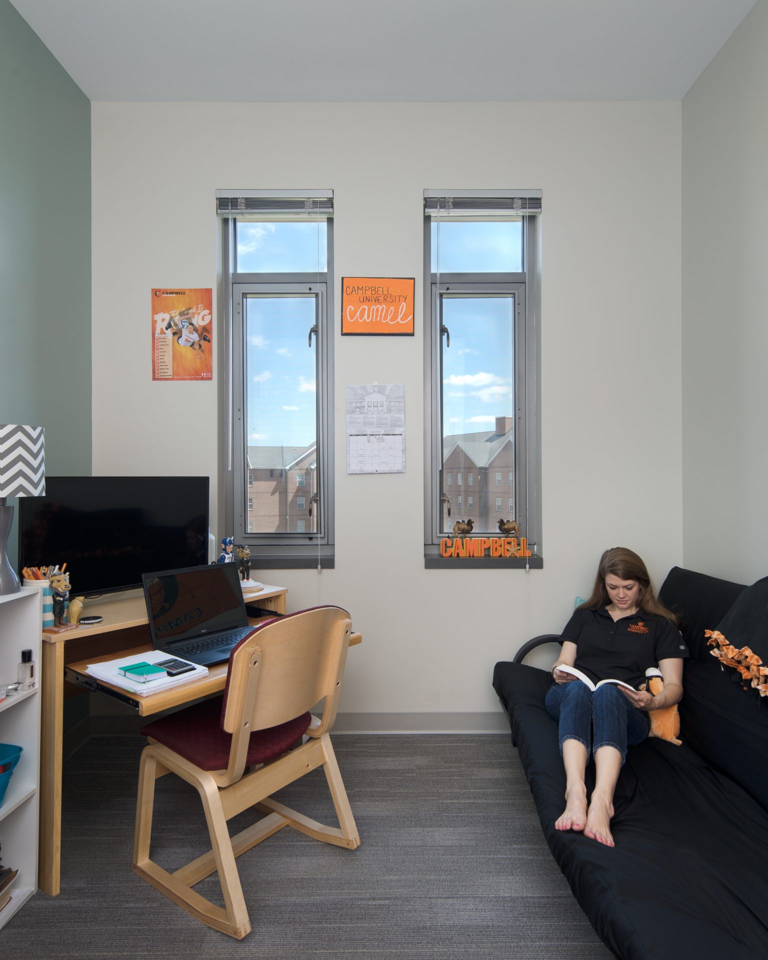 While many on-campus living experiences afford shared living and bathrooms, this residence hall is a combination of private bedrooms with private bathrooms and private bedrooms within single living units with a shared bathroom. Indoor amenities reinforcing the close-knit atmosphere of the Campbell campus include shared living room/commons area on each floor, communal kitchens, lounge and study spaces, laundry rooms and bike storage. Outdoors students can enjoy sand volleyball courts, a wood deck patio and a courtyard.