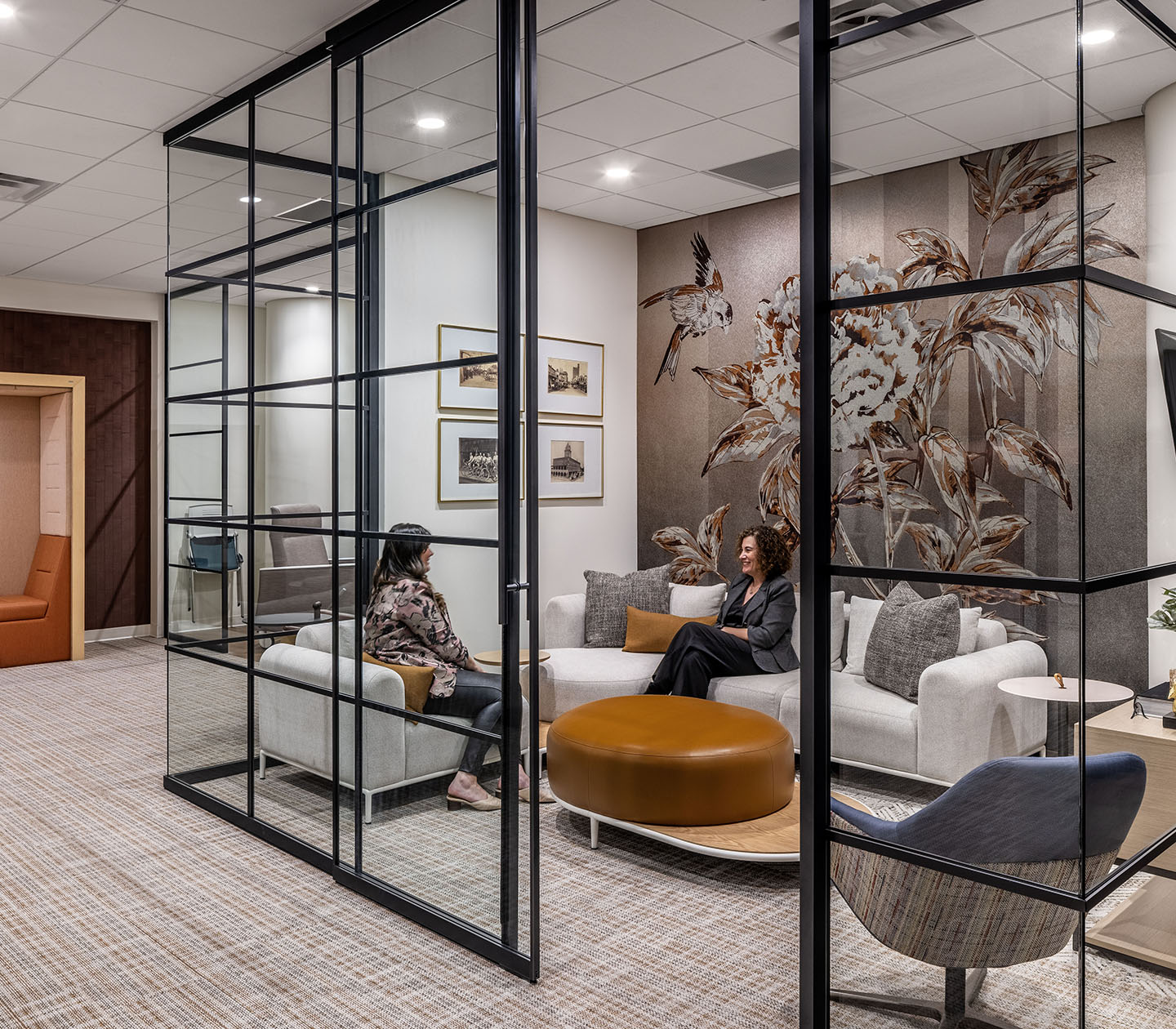Designed to celebrate culture and innovation, the space invites visitors into a welcoming café-style lounge that gradually transitions into collaborative work zones. These areas are defined by transparent partitions, rich textures, and architectural features such as a sculptural curved glass wall. The showroom stands as a living example of how thoughtful design can drive engagement, attract talent, and build community by creating a place where people can work, connect, host, and find inspiration.