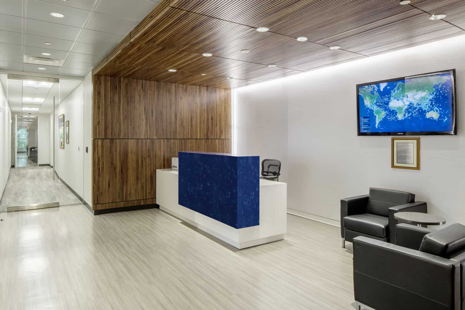 This newly designed office space for a confidential client brings together functions from different offices and offers huddle and collaborative areas within an open office layout. These essential design features create a bright, transparent, and dynamic work environment that aligns with the client’s company mission and objectives. The office also includes a conference room, lounge, and cafeteria, which can be combined to form a spacious meeting area for ultimate versatility. The overall design aesthetic reflects a modern office environment, with touches inspired by the client’s maritime-focused business.