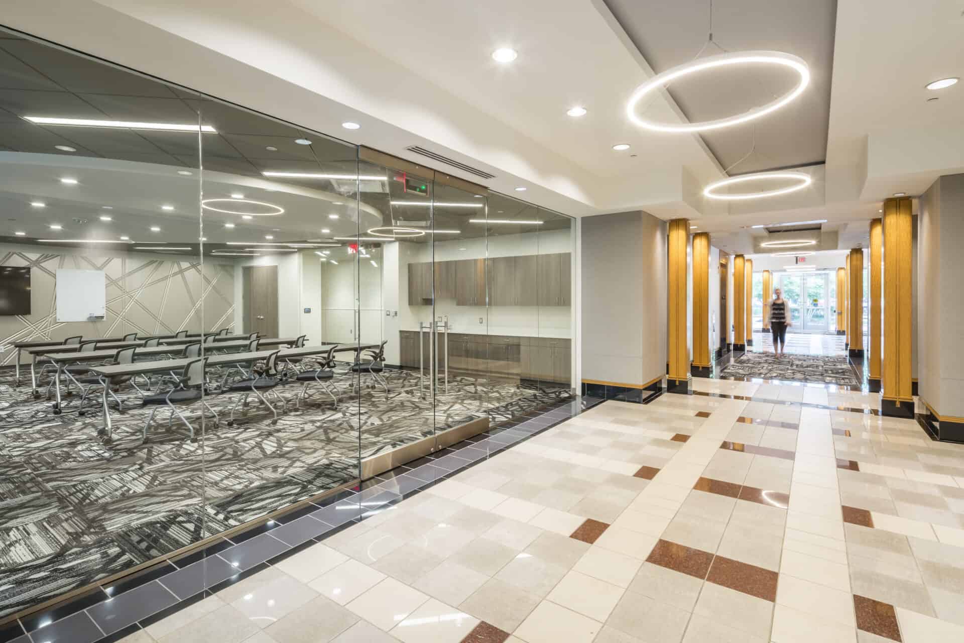 Different types of workstations were created, and teams were organized with open collaboration areas in between. Existing walls were maximized, with offices transformed into smaller huddle spaces, while larger conference rooms were updated with new finishes. The existing furniture slated for relocation was thoughtfully coordinated with new pieces and strategically placed throughout the space.