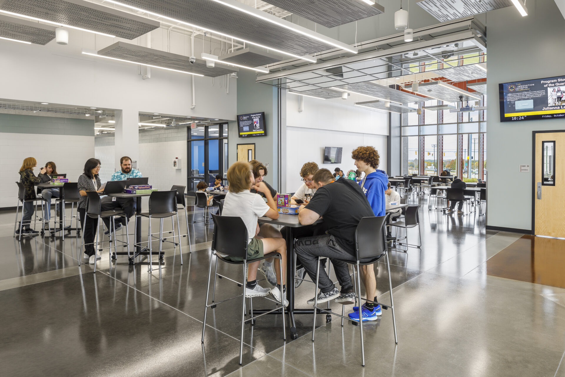 Little designed an adaptable and flexible space featuring collaborative classroom spaces, labs, study rooms, a café, and an outdoor classroom.