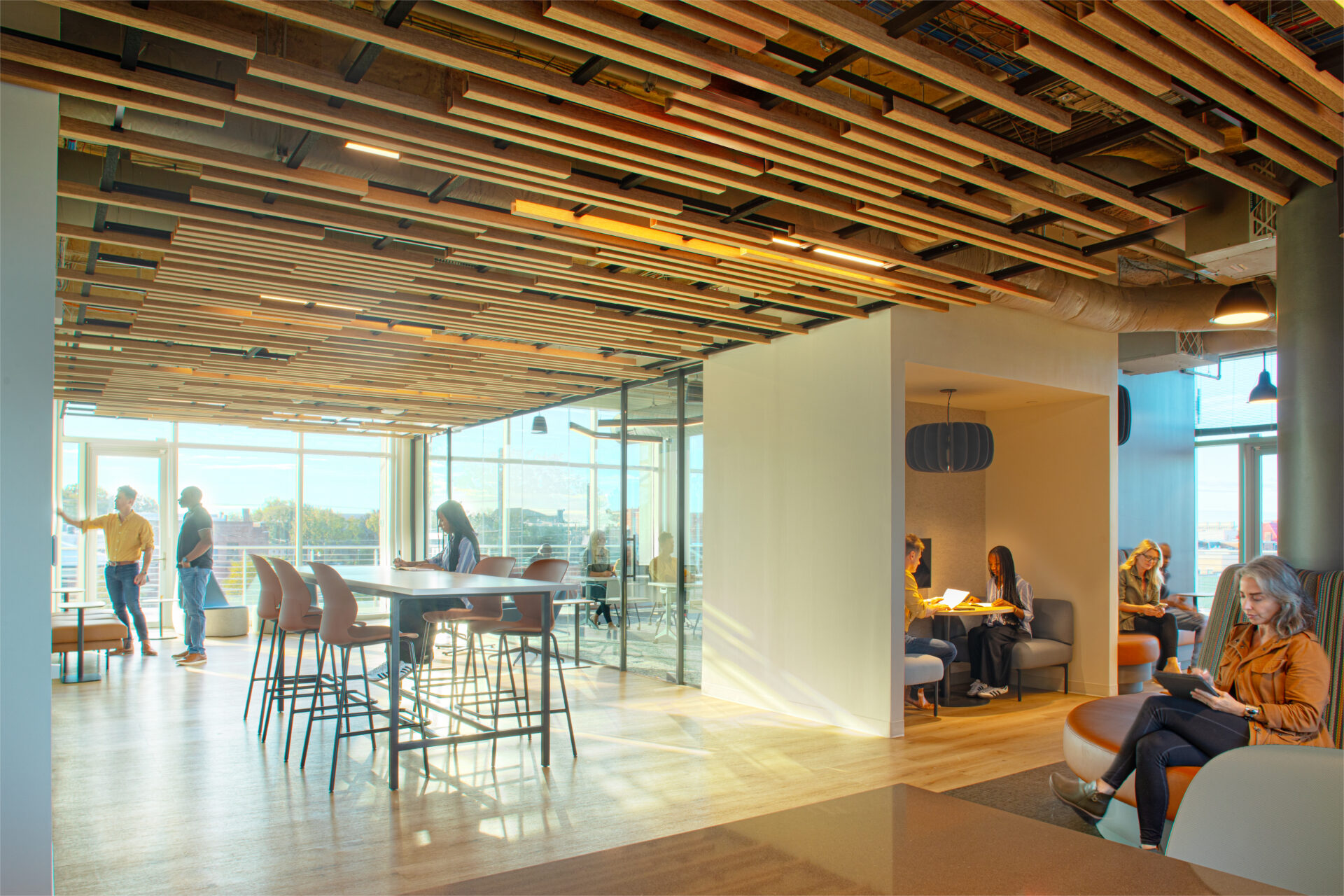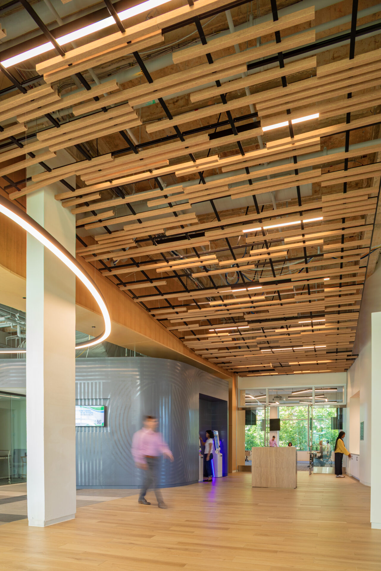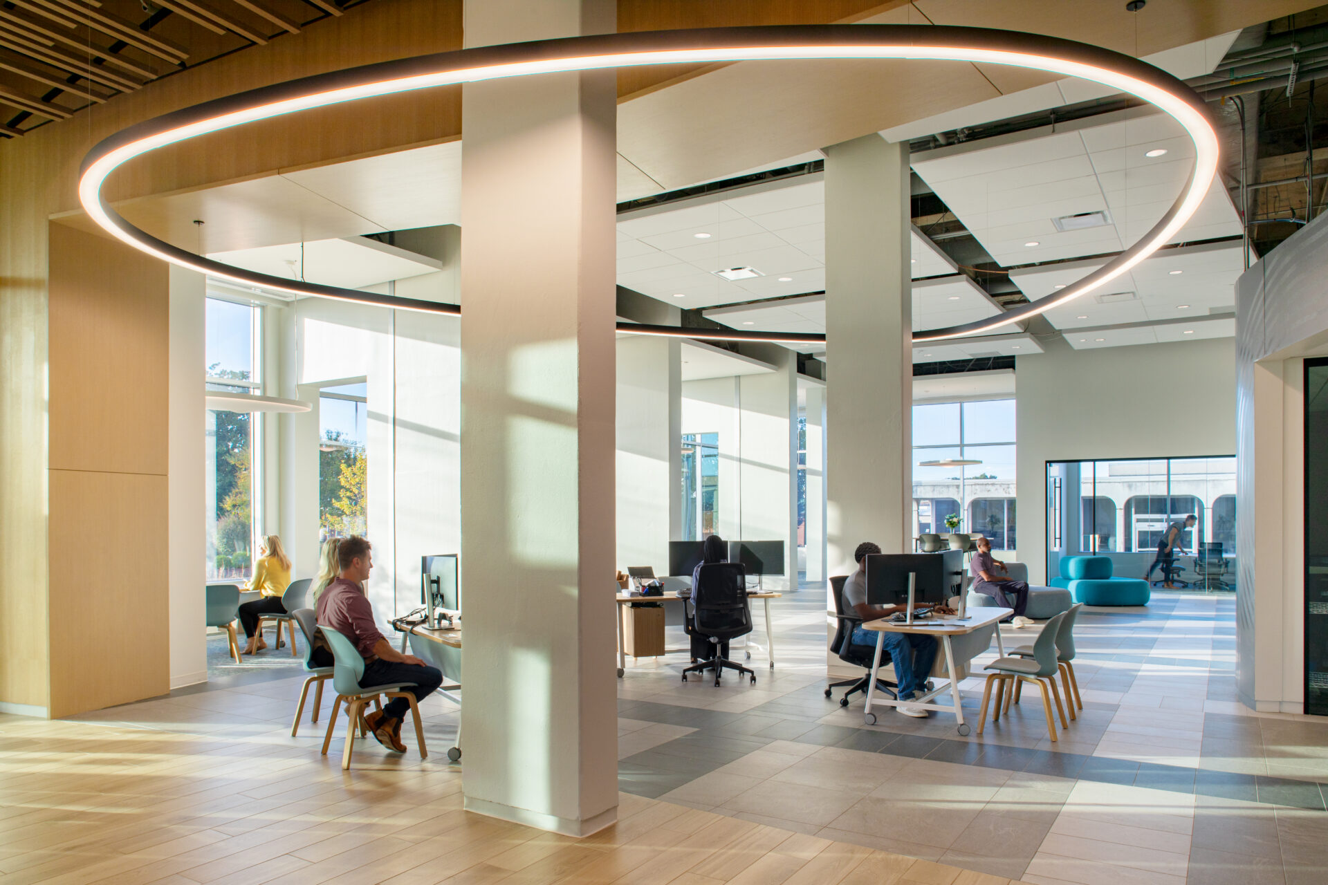 Interior spaces were opened to bring natural light deeper into the building, improving comfort and visibility. This increased transparency fosters a more inviting atmosphere while supporting productivity and overall user experience.