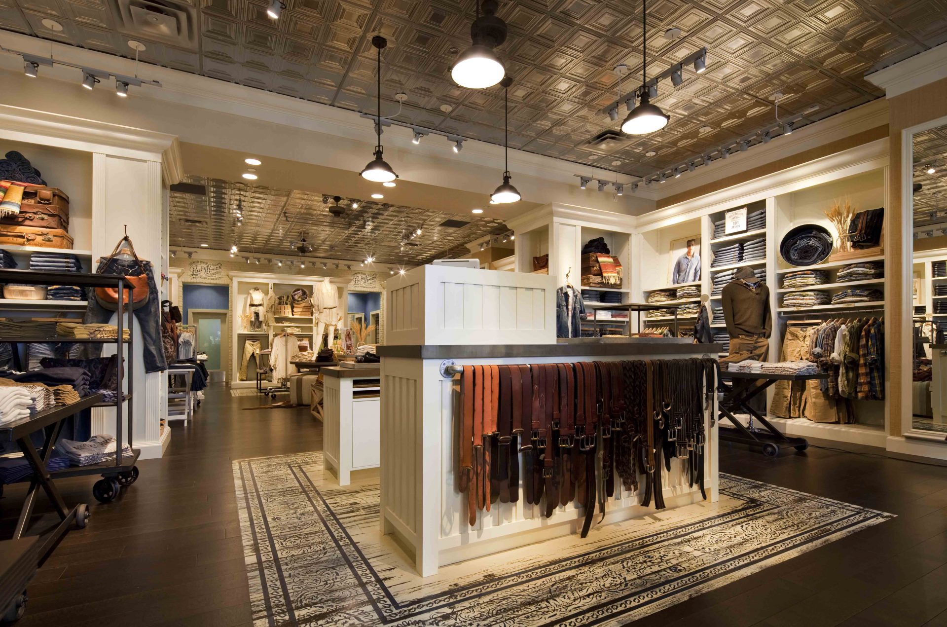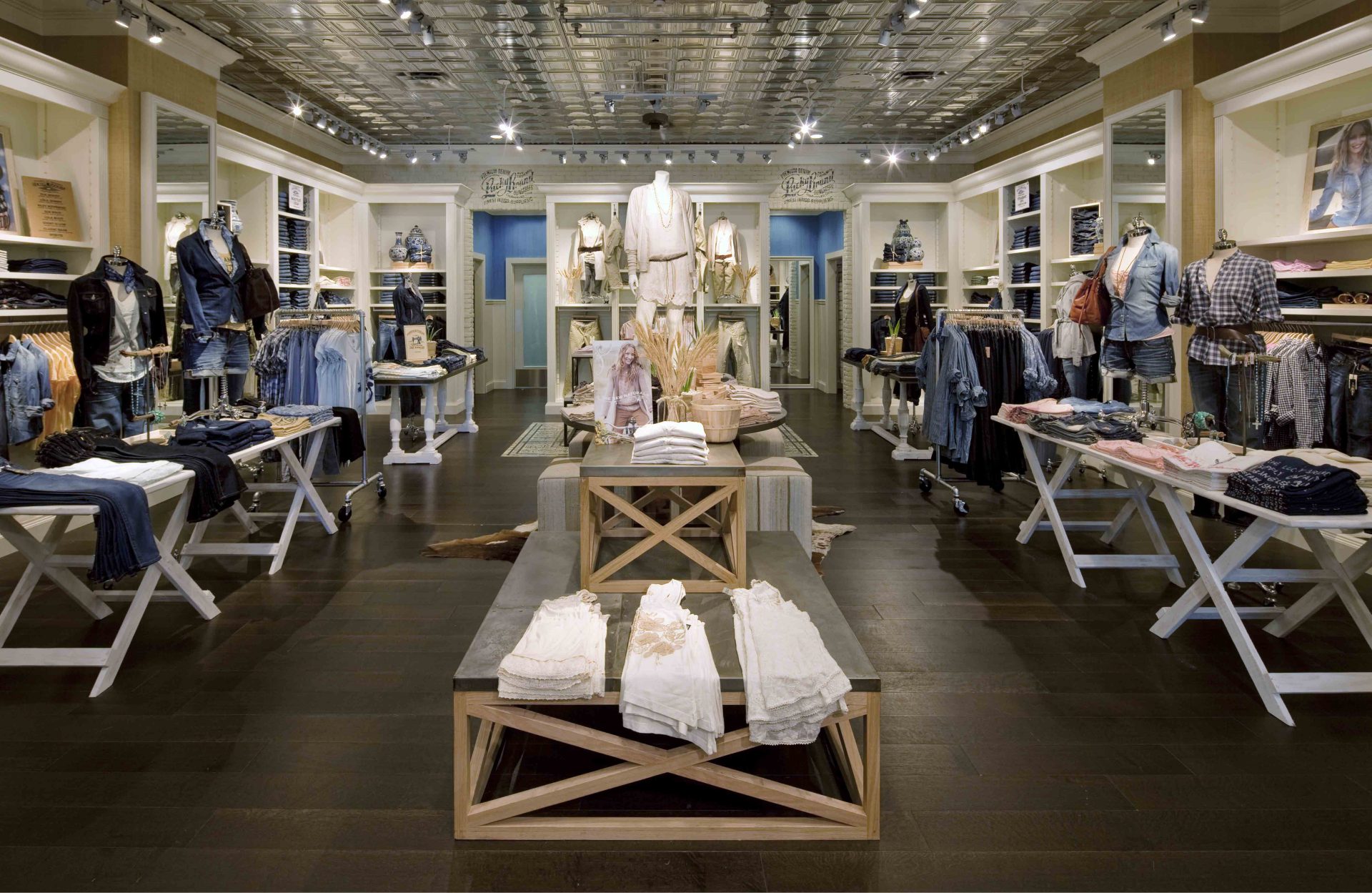 The Lucky Brand core brand attributes – Spirit, Freshness, Americana, Nostalgia, and Freedom - further evolved through the opening of this store location. While Reinforcing the retailer’s denim heritage, the space emphasizes natural materials such as grass cloth wall coverings, wide-planked hardwood flooring and tin ceilings. A crisp white and navy-blue exterior palette lend a fresh and striking juxtaposition against the surrounding dessert colors and landscape. Located in a development designed to be LEED certified, designers implemented a sophisticated storefront glazing system to help regulate energy use in the demanding desert climate.