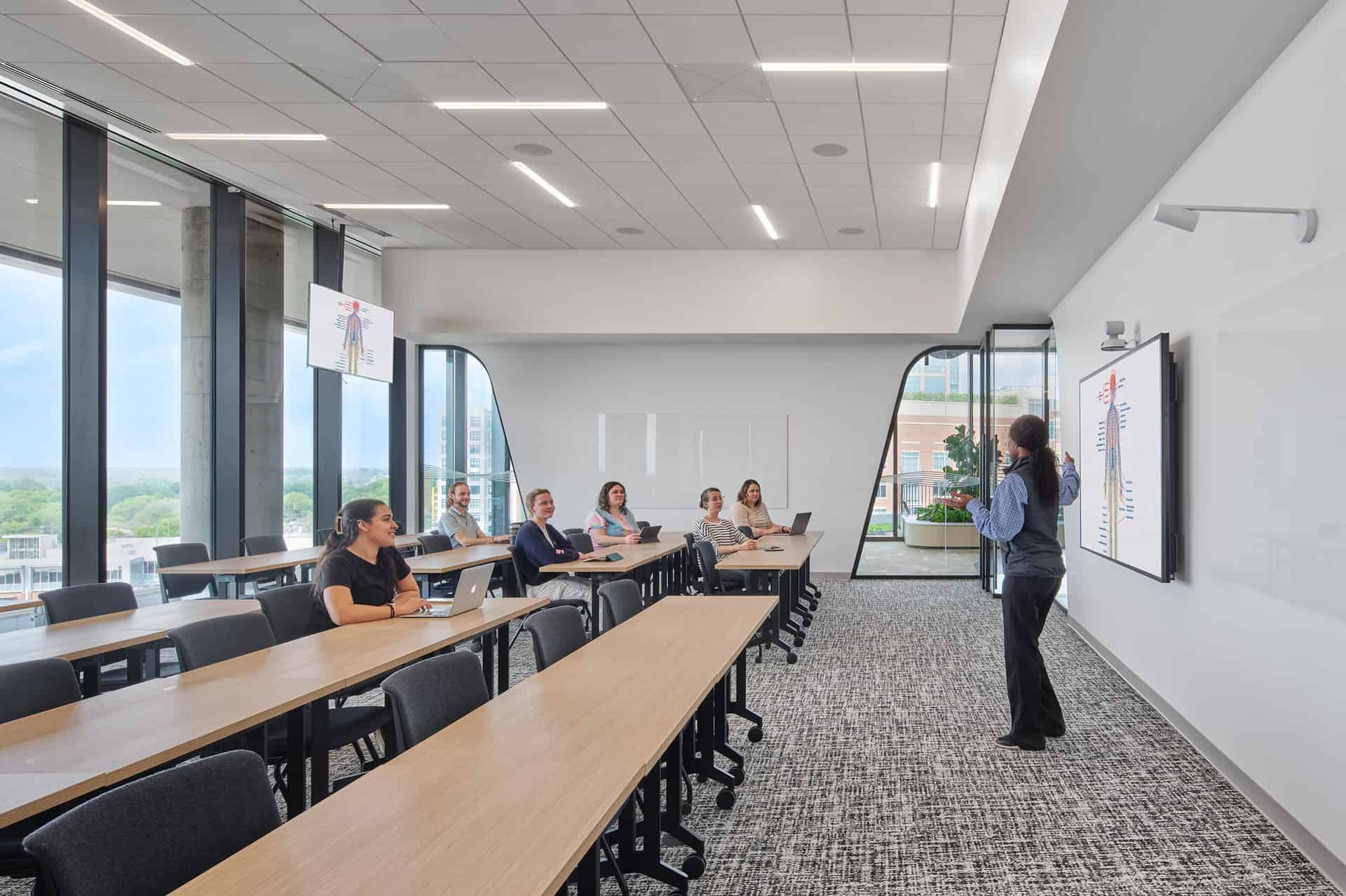 Located in the heart of the bustling South End neighborhood in Charlotte, NC, Northeastern University's Center for Health Sciences is a state-of-the-art facility offering an immersive learning environment that fosters collaboration, flexibility, and growth for students and faculty alike. Housed within The Line building, the project transforms high-rise office space into dynamic instructional areas, serving over 400 students and providing multi-purpose educational and training spaces for nursing, speech pathology, and health sciences programs.