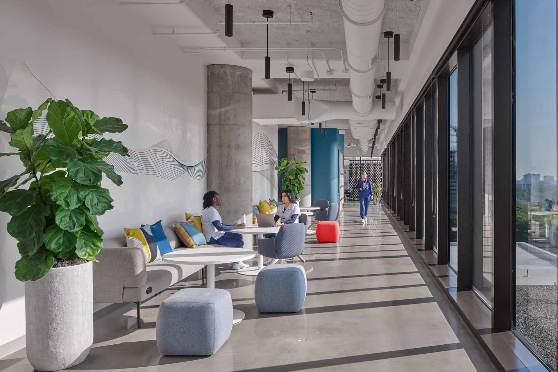Little pooled design experts from our Workplace Office, Higher Education, and Healthcare practices to creatively combine different spaces. Unlike traditional university facilities, this project emulates today’s trending workplace and showcases truly immersive—and scalable—settings. The new design reflects the spirit of Northeastern and its surrounding community, creating a vibrant and welcoming space that sets up students for success in the healthcare field.
