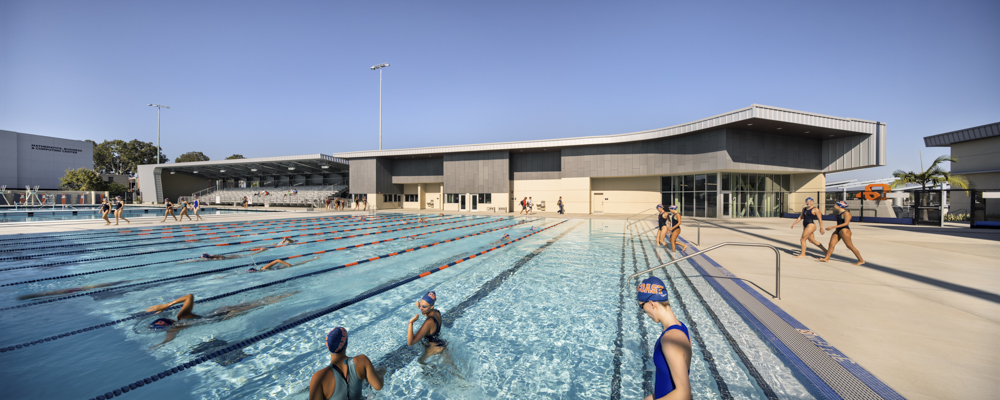 The complex houses multiple pools including an adaptive pool for students with disabilities, training facilities, instructional spaces, and conference space.