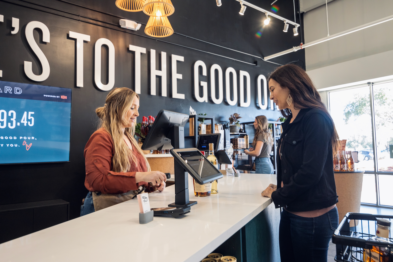 The Pour Board shows the current charities and the amounts donated to each. Linked to the POS system, it updates in real-time with each donation. Positioned between the sales floor and the gifting area, shoppers can catch a glimpse immediately upon entry.