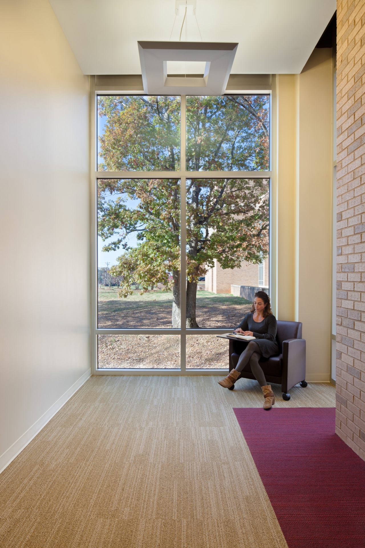 The interior features a variety of flexible learning environments, ranging from small classrooms to a 75-seat lecture hall, in addition to inviting study nooks, comfortable lounges, an art studio, and a dedicated gallery space. The orientation and openness of the building emphasize daylighting and transparency, with large windows fostering strong connections to the outdoors. The materials reflect a blend of tradition and innovation, with campus-matching brick and a striking zinc-clad rear elevation visible from the highway, reinforcing a progressive identity.